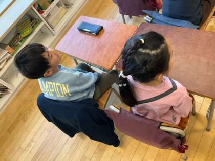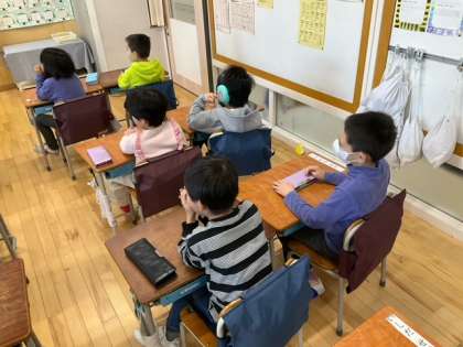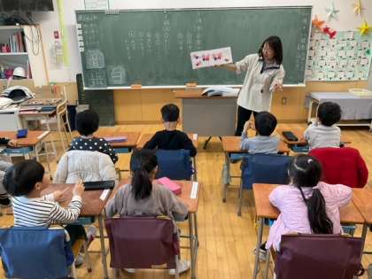 国語の時間です。先生が読み聞かせをしてくれています。言葉あそびがすごく楽しい一冊ですね。