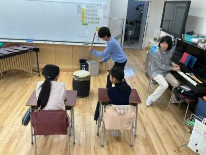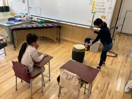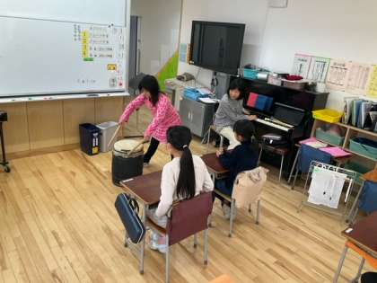 グループ学習の時間です。4、5、6年生の音楽です。太鼓に挑戦しています。