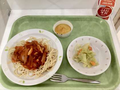 献立 きのこのトマトソーススパゲッティ、キャベツとクリームコーンのサラダ、みそマフィン、牛乳