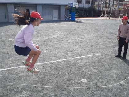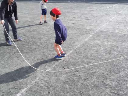 体育の時間です。長縄の練習をしました。タイミングよく縄に入って跳べるように声を掛け合いました。