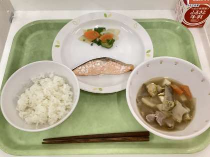 献立 ご飯、鮭の塩焼き、かぶの浅漬け、豚汁、牛乳