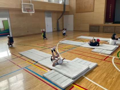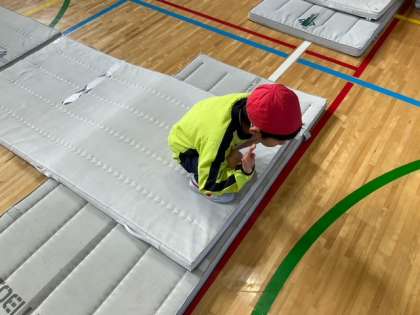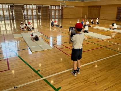 体育の時間です。マット運動に取り組んでいます。動きをiPadで撮影して、改善点などを伝えあいます。