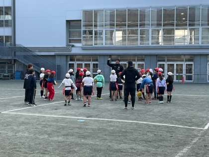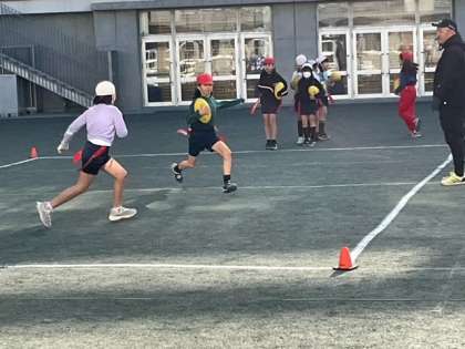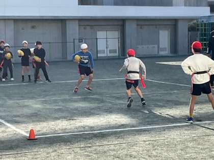 リコーブラックラムズの方を講師に、タグラグビー教室を開催しています。「ナイストライ!」の声が、校庭に響いています。