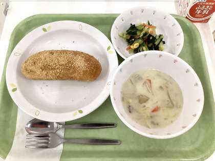献立 きなこ揚げパン、ほたてと白菜のクリーム煮、ほうれん草とコーンのサラダ、牛乳