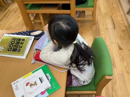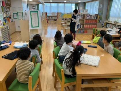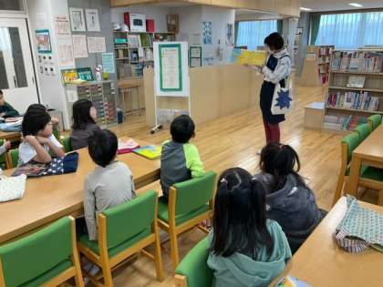 読書の時間です。司書の先生の読み聞かせです。子どもが幼いときには、「読み聞かせは最高の贈り物」という言葉があります。