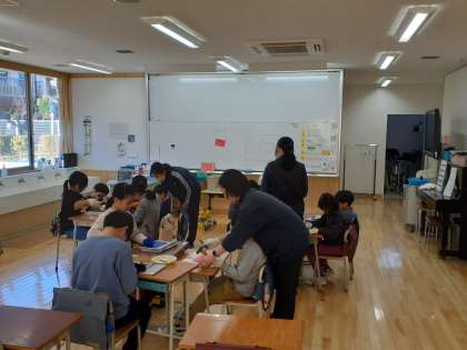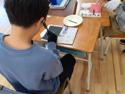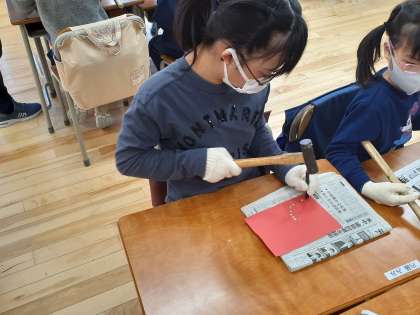 図工の時間です。ポンチと金づちを使って、模様を作っていきます。とんとん、よい音が響いています。