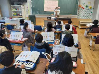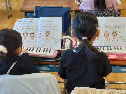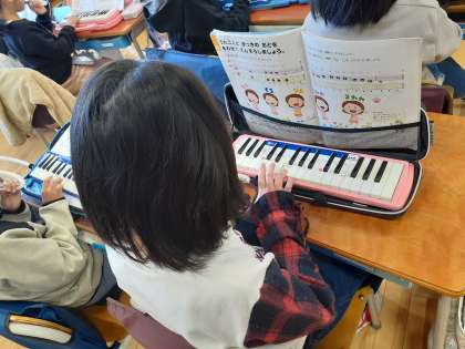 音楽の時間です。ピアニカを練習しました。同じ音を出すときの指使いに気を付けました。