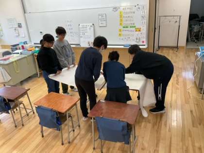 グループ学習の時間です。5、6年生は、お店屋さんに向けての準備を進めています。