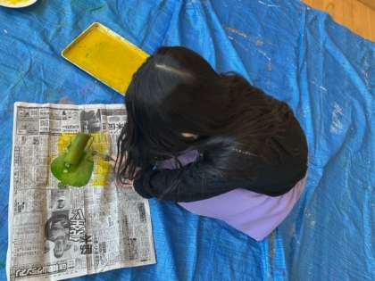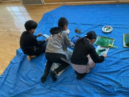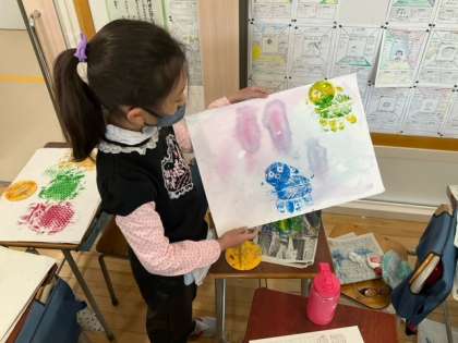 図工の時間です。「でこぼこさん 大集合」すてきな版画の作品が出来上がってきましたね。