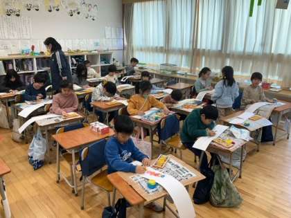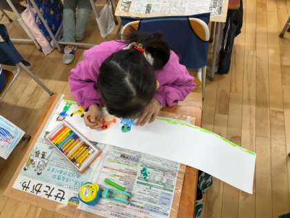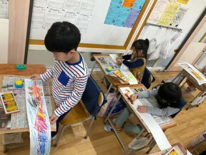 図工の時間です。「なが〜い かみから」どんどんつなげて、長〜い作品にしてみよう!