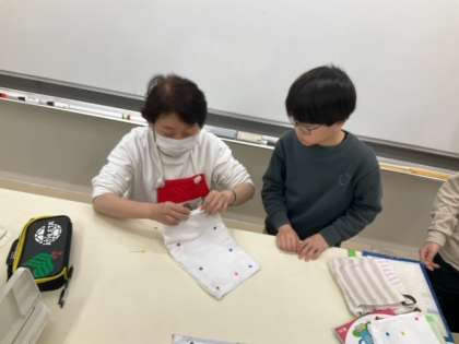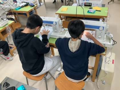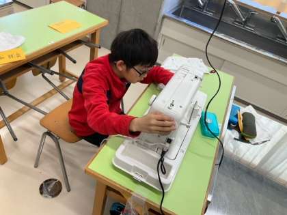 家庭科の時間です。雑巾づくりが進んでいます。ミシンも上手に使えています。