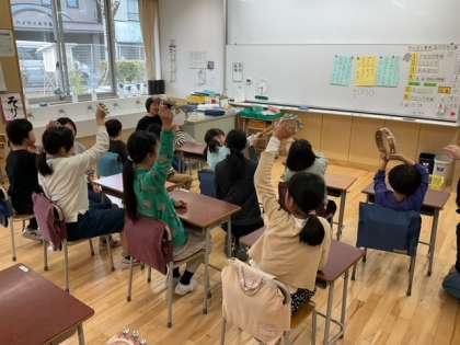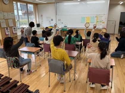 音楽の時間です。「小さな世界」振りを付けて歌と合奏をしています。