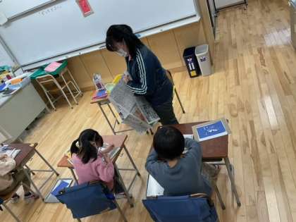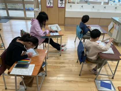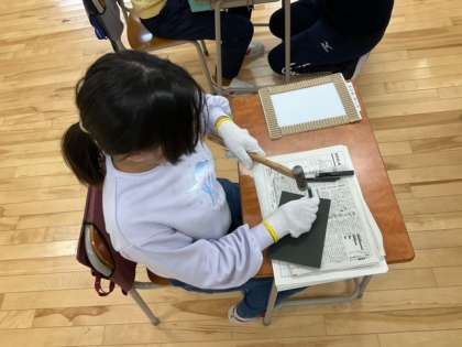 図工の時間です。「ポンチでゴー」絵も額縁も手づくりです。すてきな作品になりそうで、わくわくしますね。