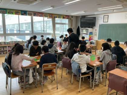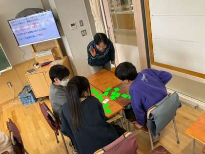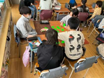 外国語の時間です。「英語で神経衰弱」カードゲームを楽しむながら、自然に英語を身につけています。