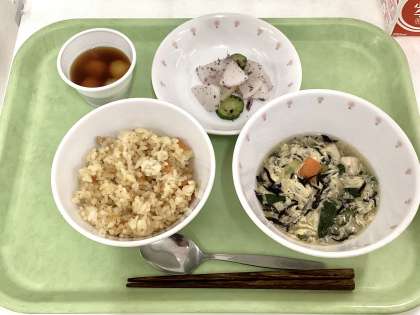 献立 子ぎつねご飯、大根のゆかり和え、ひじきと卵のスープ、みたらしだんご、牛乳