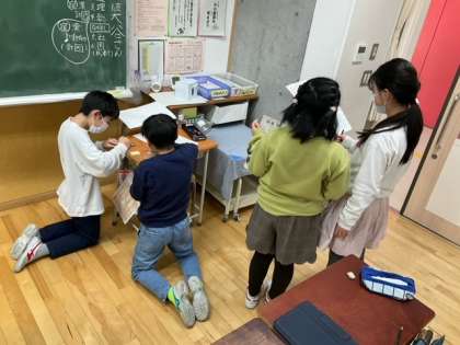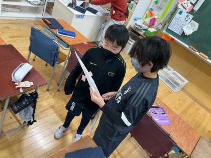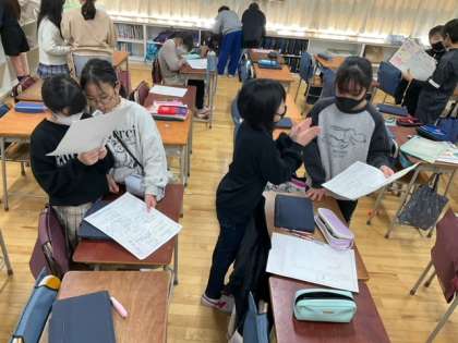 総合的な学習の時間です。「自分新聞」の発表会のあと、お互いに感想を伝え合っています。