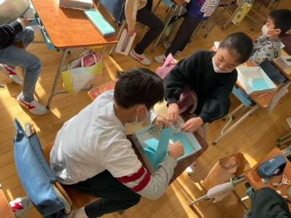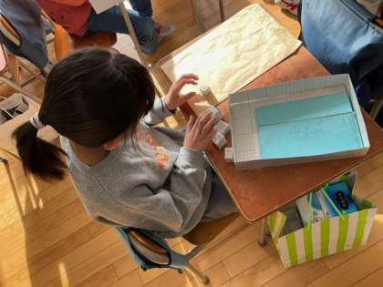 算数の時間です。「はこの形」工作用紙を使って、いろいろな箱を作りました。これからの学習につながっていきます。