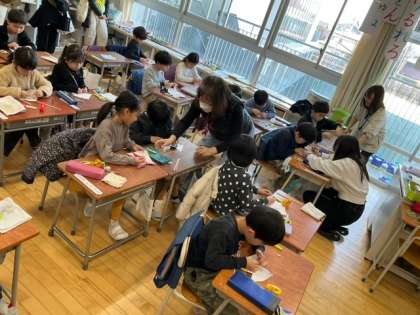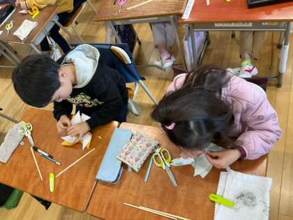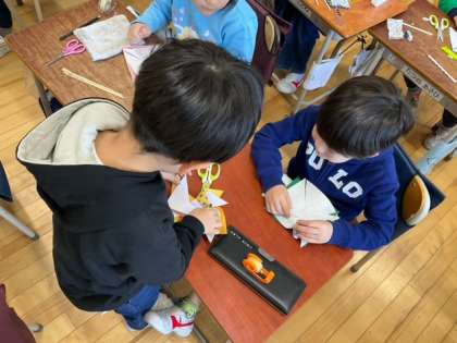 生活科の時間です。「ふゆをたのしもう」かざぐるまを作って、思い切り風と遊びます。