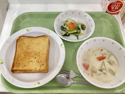 献立 ハ丈レモントースト、米粉のクリームシチュー、ほうれん草とコーンのサラダ、牛乳
