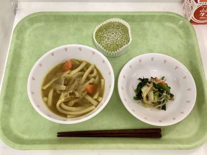献立 カレーうどん、ほうれん草のお浸し、小松菜とチーズのケーキ、牛乳