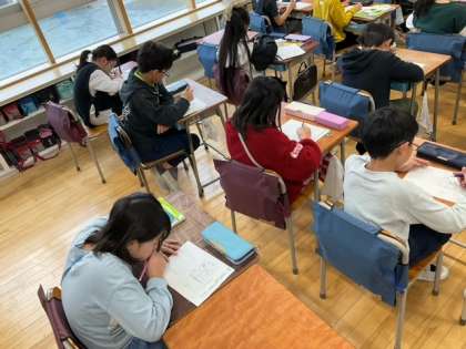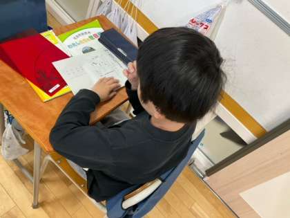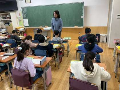 社会科の時間です。「きみは今、どちらの方角に歩いているか?」4年生に向けてのミニテストをしています。
