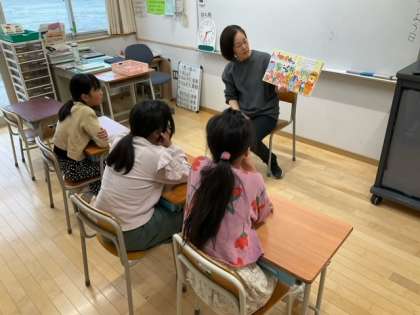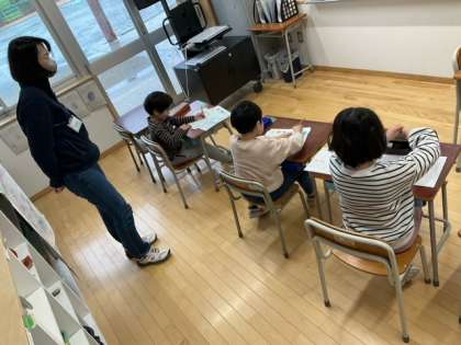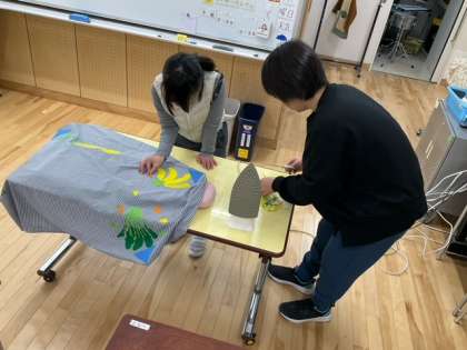 グループ学習の時間です。6年生の卒業制作「配膳台カバー」づくりが進んでいます。模様をつけているところです。