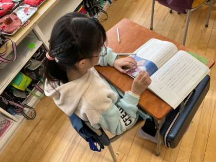 国語の時間です。「スーホの白い馬」人物の様子があらわれている言葉に気をつけて、物語を読み進めています。
