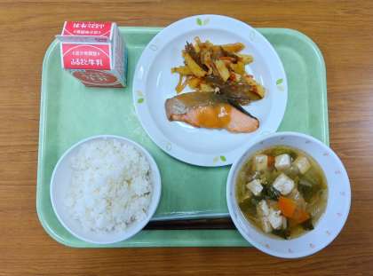 献立 有機米ご飯、鮭のゆず味噌かけ、じゃが芋のきんぴら、白菜スープ