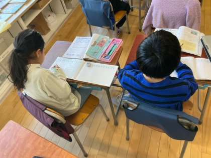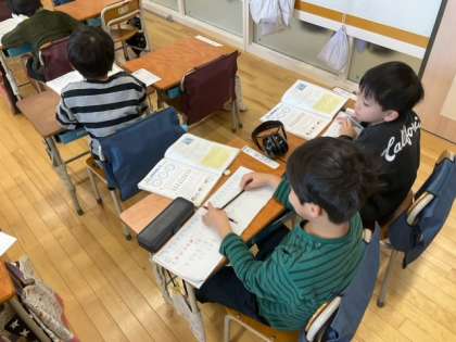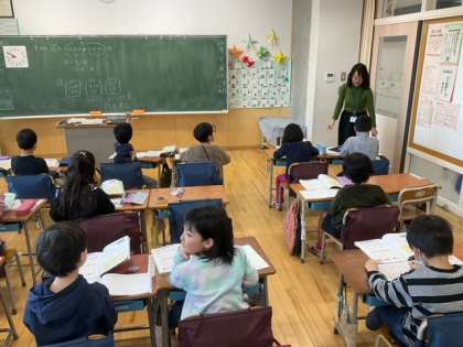 算数の時間です。「どんなしきになるのかな」文章をよく読んで、式を考えています。1年生の算数も、まとめの時期ですね。