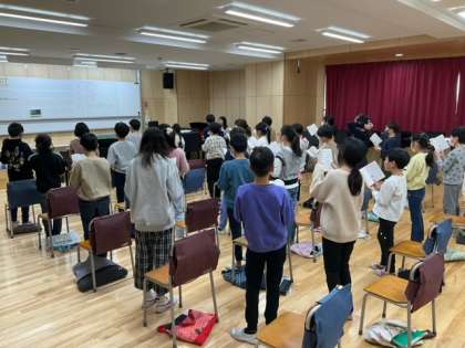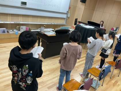 音楽の時間です。「大切なもの」を合唱しています。何回聴いても、本当にいい曲です。