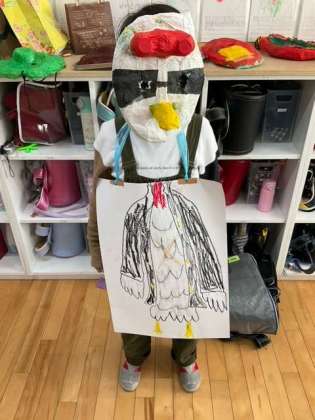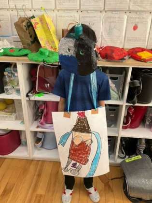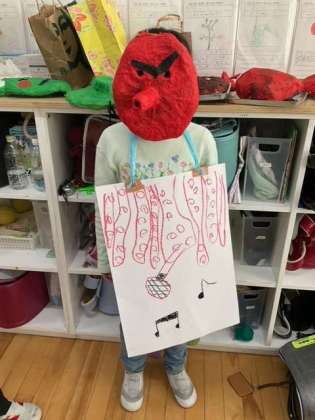 図工の時間です。「かぶって へんしん」衣装もつけて、本格的に変身しました。かっこいい!