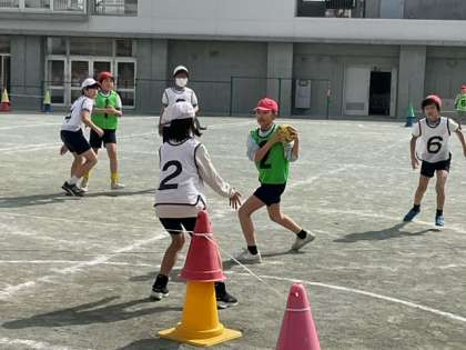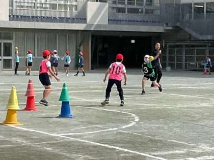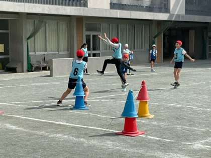 体育の時間です。「ハンドボール」のゲームをしています。コートを大きく使って、ダイナミックに動いています。