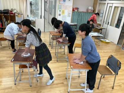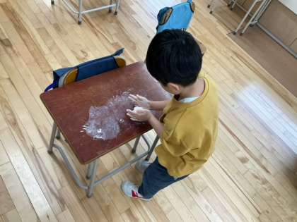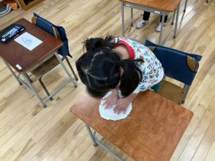 図工の時間です。紙粘土でアクセサリーを作ります。まずは、粘土をよくこねて!
