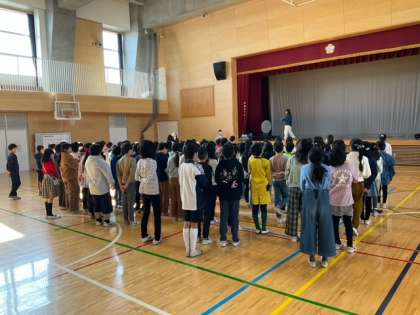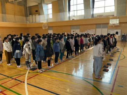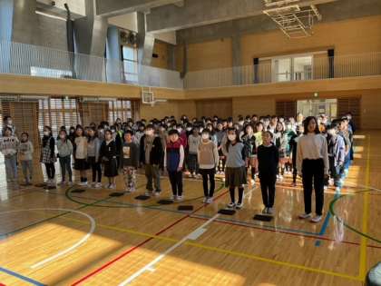 学年練習の時間です。6年生を送る会の練習をしています。合唱「大切なもの」声が響き合っています。