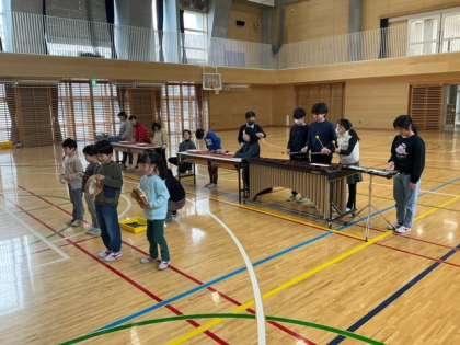 6年生を送る会の練習をしています。感謝の言葉のあと、「小さな世界」の合奏を披露します。