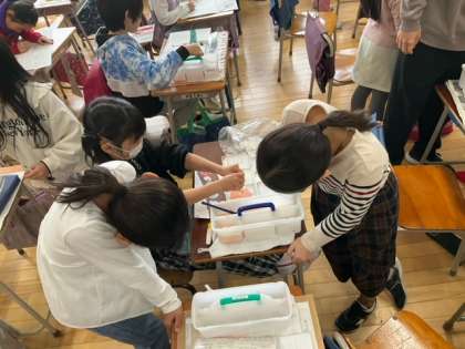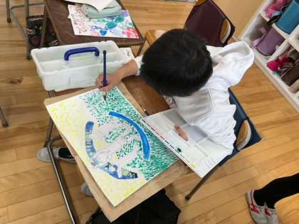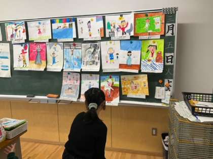 図工の時間です。作品の仕上げと鑑賞、1年間の学習の振り返りをしています。