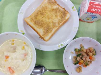 セサミトースト 米粉のコーンシチュー ビーンズサラダ