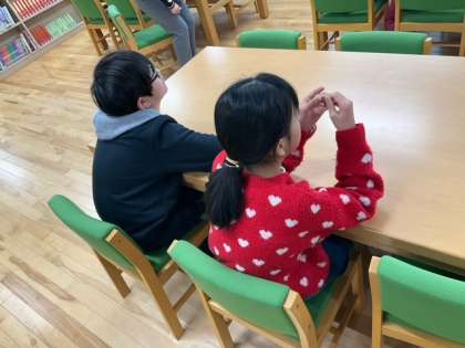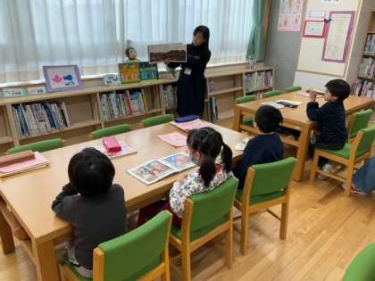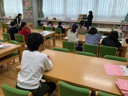 読書の時間です。司書の先生の読み聞かせです。「はやく あいたいな」ぐんぐんお話に引き込まれましたね。