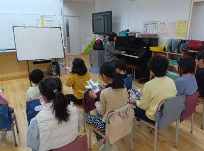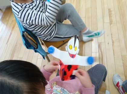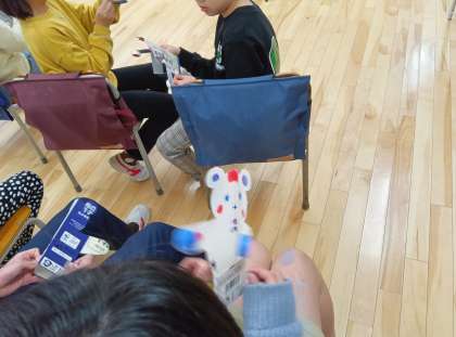 音楽の時間です。牛乳パックを形取り、ペットボトルのフタをつけて打楽器にして、演奏しました。
