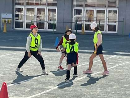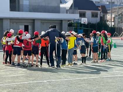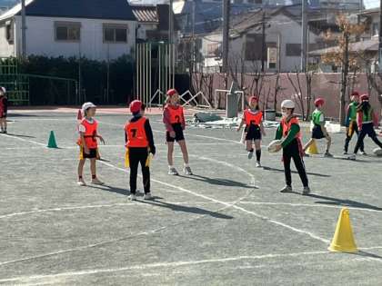 体育の時間です。円陣を組んで、気持ちを高めています。ウォームアップをして、タグラグビーの試合です。