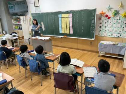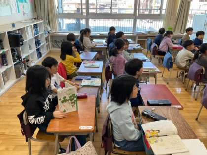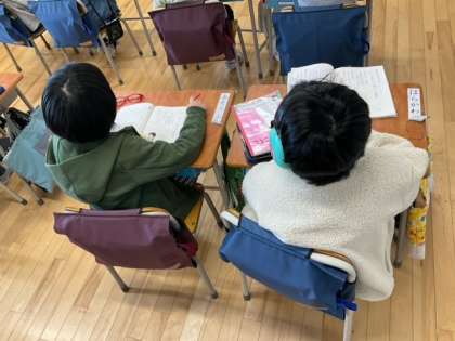 国語の時間です。「いいこといっぱい 1年生」作ったメモを見ながら、清書に取り組みます。