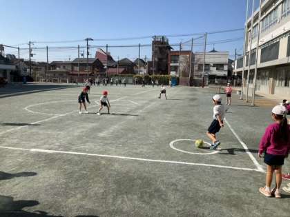 体育の時間です。「キックベース」の試合です。チームで作戦もしっかりと立てています。