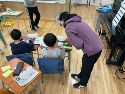 図工の時間です。「ゆらゆら工作」紙皿を利用して、ゆらゆらと動く作品を作っています。