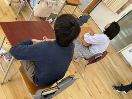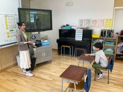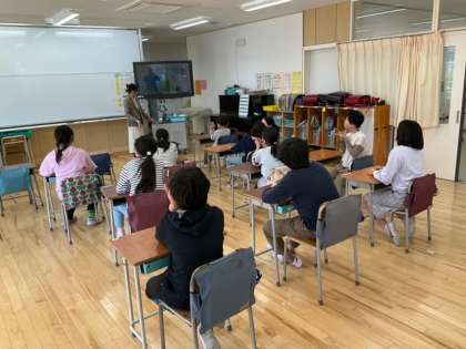 外国語活動の時間です。フラッシュカードを見ながら、発音の練習をしています。1年生は、入学式歓迎の演技の練習です。