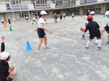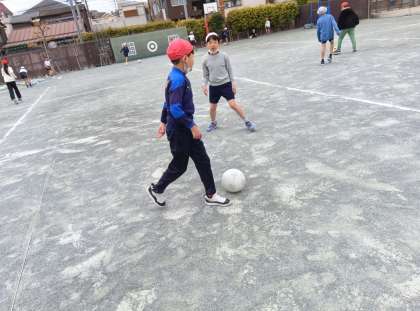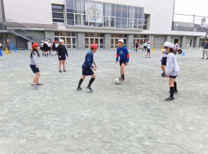 体育の時間です。サッカーは難しい運動ですが、一生懸命ボールを追っています。声をかけ合う姿がたくさんありありました。