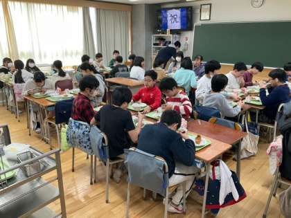 令和5年度最後の給食になりました。6年生は、小学校生活で最後の給食ですね。お祝いの気持ちを込めて「お赤飯」です。