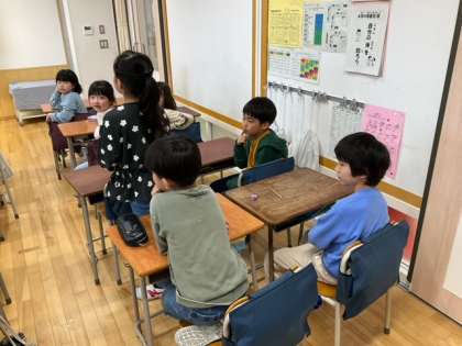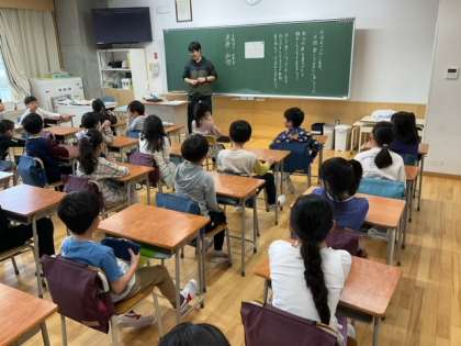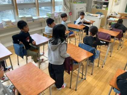学級活動の時間です。新しいクラスになって、まずは、自己紹介をしています。みんなニコニコしていますね。