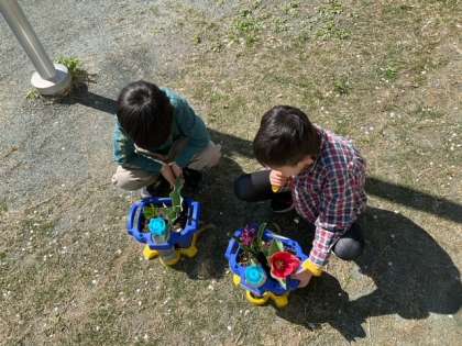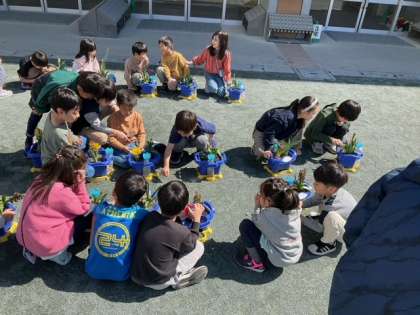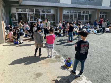 生活科の時間です。一人一鉢でチューリップを育ててきました。入学式では、チューリップできれいな花道を作りました。
