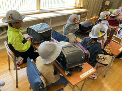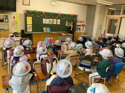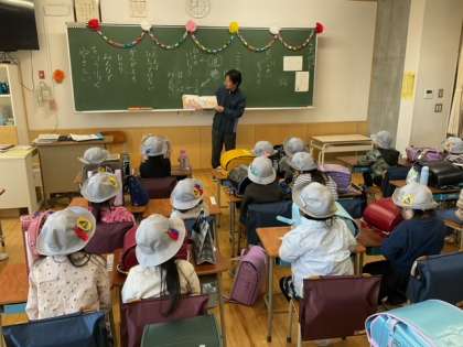 下校の前に、先生が読み聞かせをしています。お話に引き込まれています。