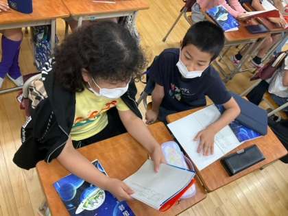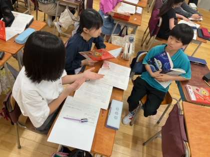 国語の時間です。「銀色の裏地」印象に残ったところはどこですか? 友だちと伝え合いましょう。